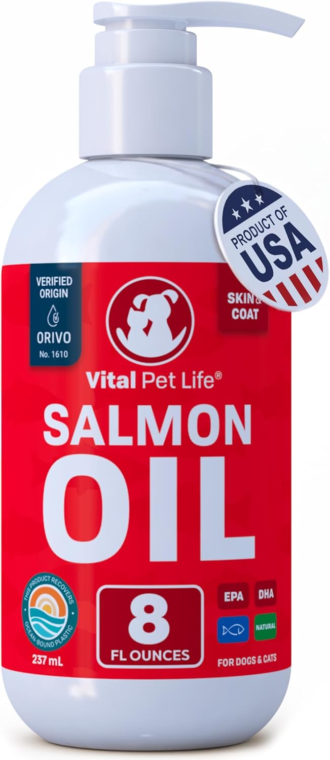 Give your pet a simple daily boost with sustainably sourced salmon oil. Packed with essential omega-3s, it helps support a soft, shiny coat and healthy skin, while also helping with dryness, itching, flaking, shedding, and seasonal allergies. Omega-3s can also support joint comfort, bone health, and a strong immune system—so your furry friend can stay active, happy, and ready for more playtime (and more hugs!).